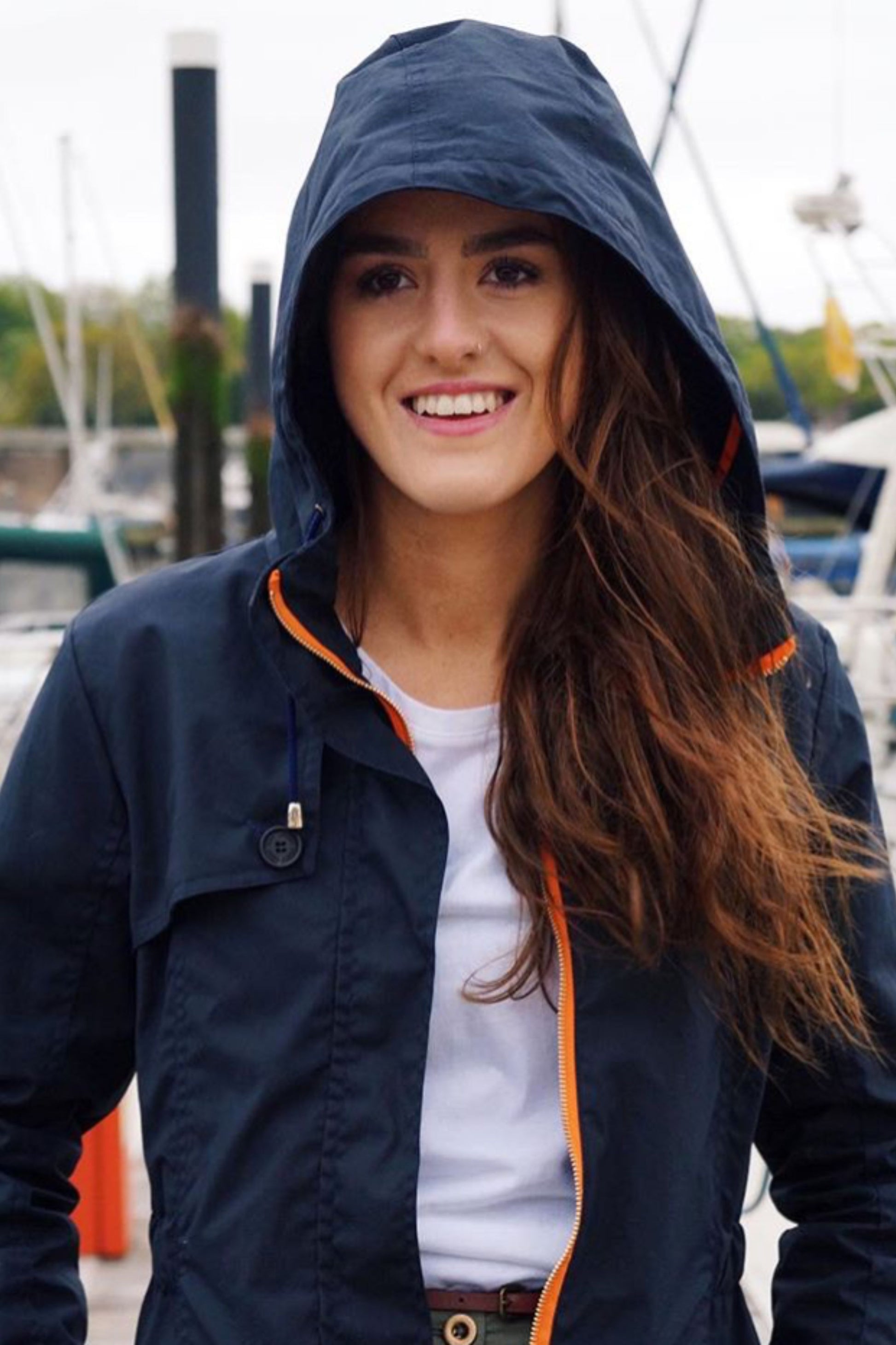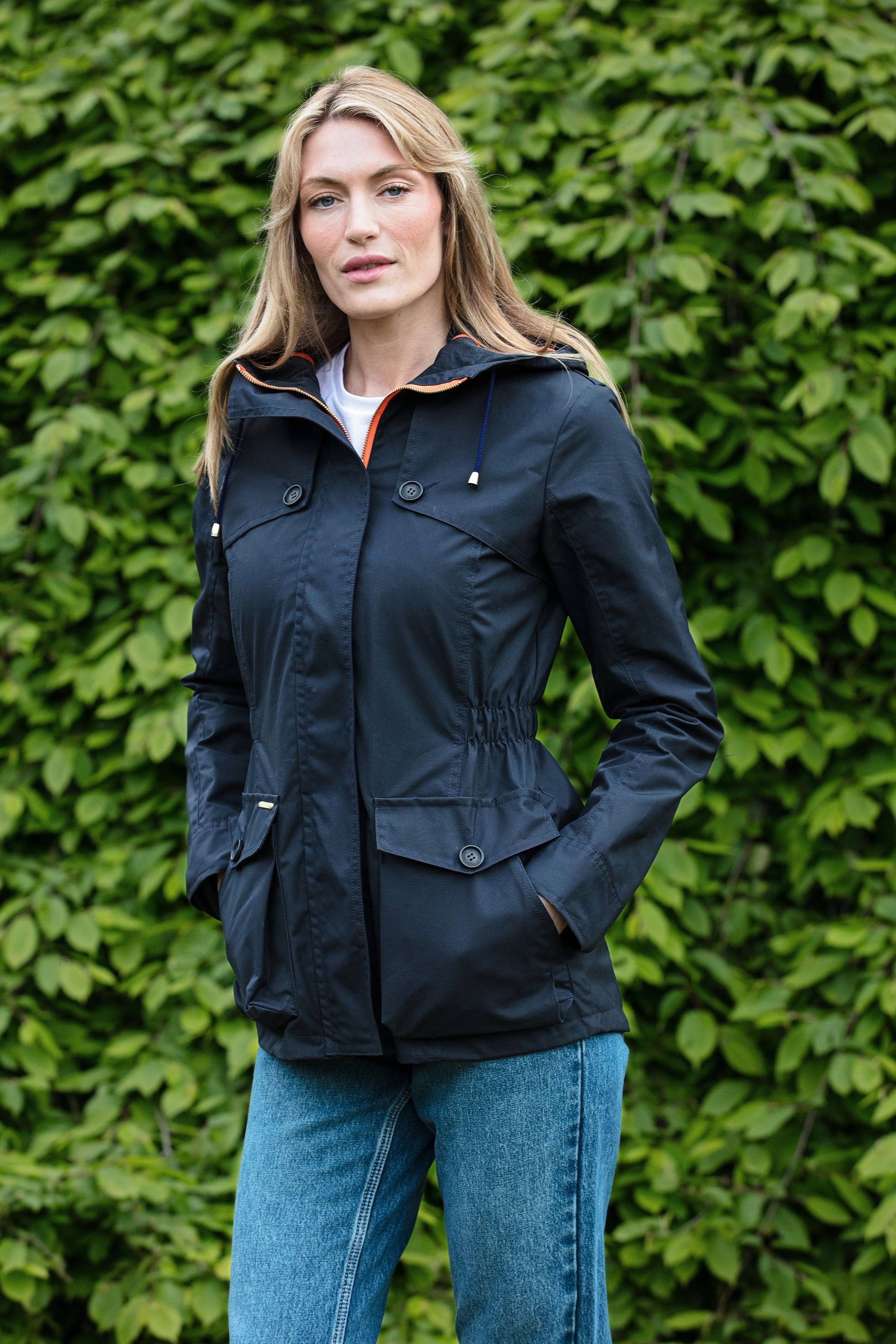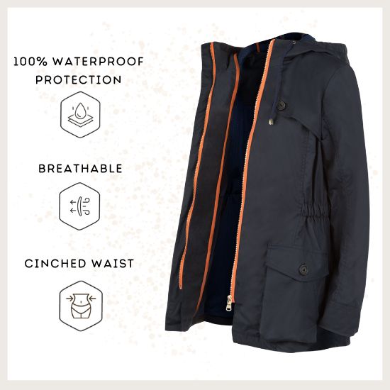 The 'pop' version of the TROY bestseller: This lightweight coat is made from 100% cotton milled in England with a dry wax finish. A black sports-luxe lining provides fully waterproof protection and brings an urban appeal to this casual but elegant coat with a cinched waist and drawstring hood. Featuring vibrant orange detailing, gold cord ends and gold engraved bar.