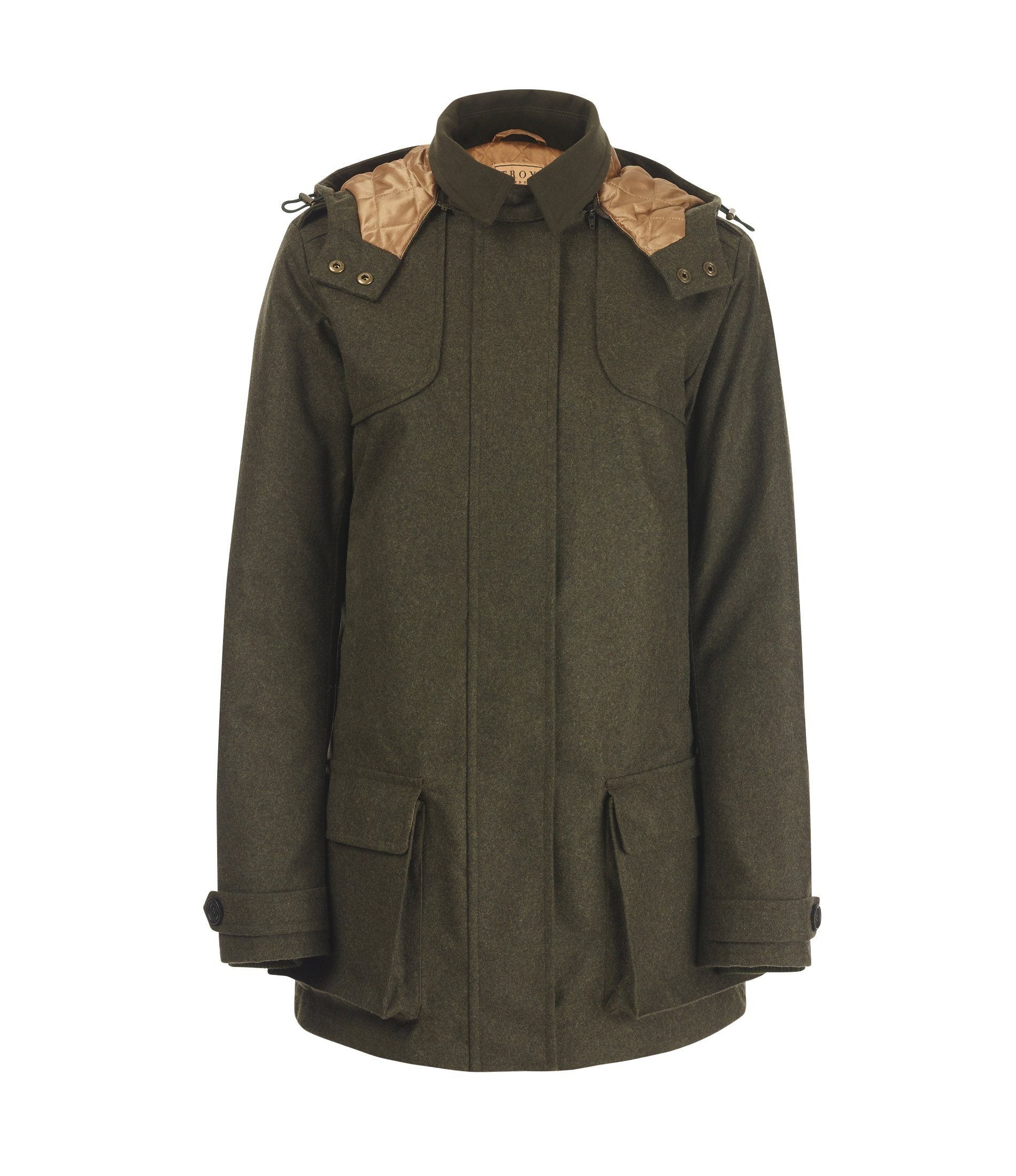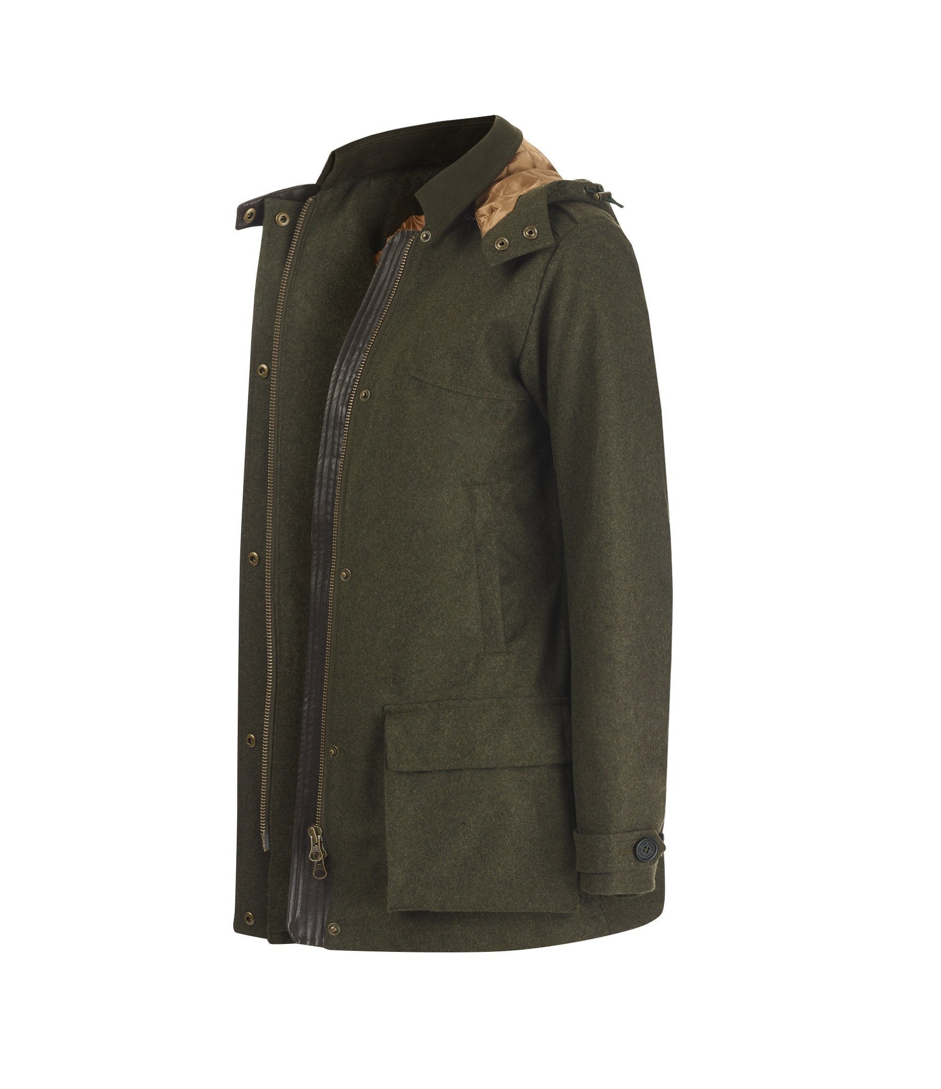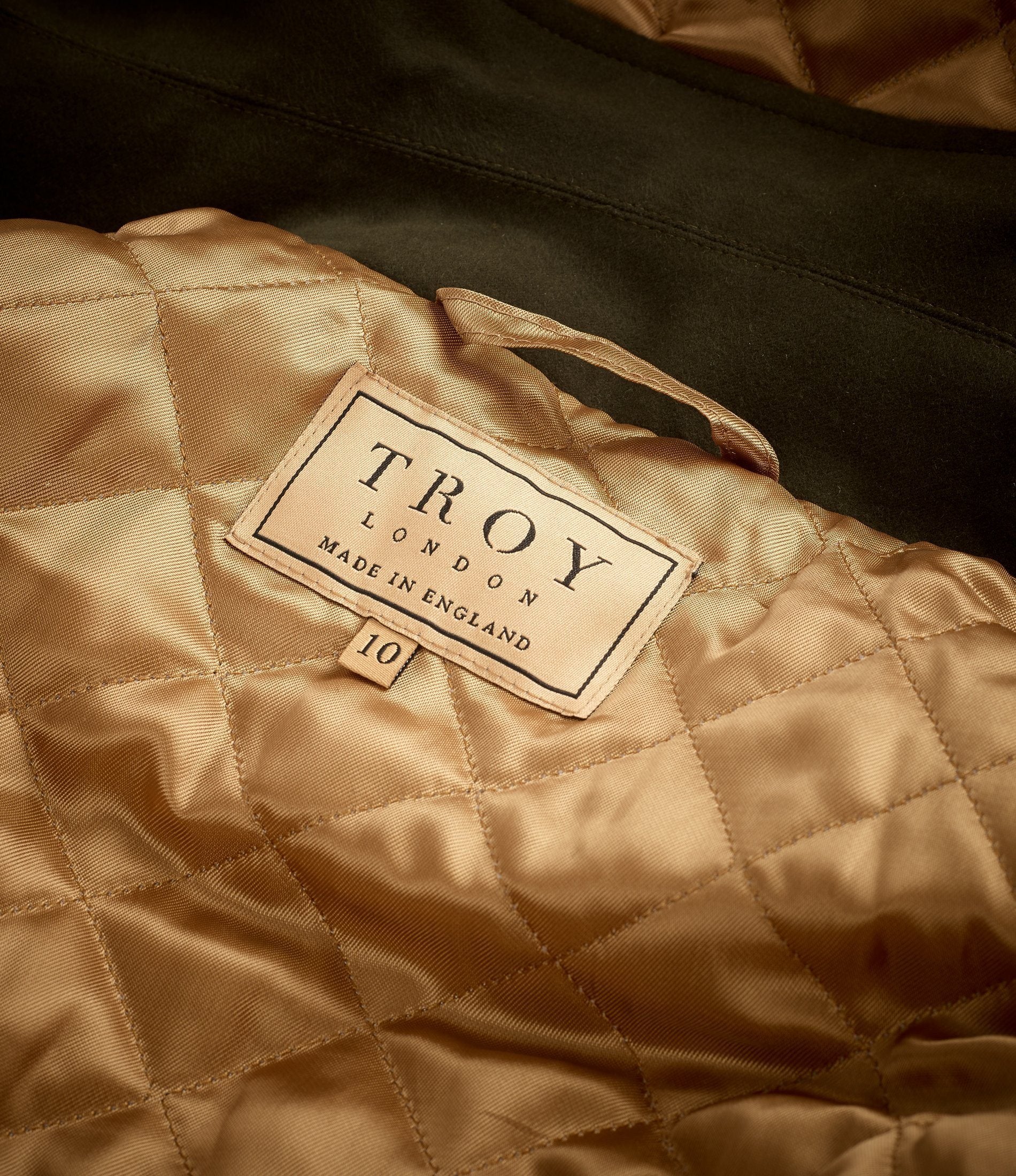 A warm, quilted outdoor coat in Melton Wool and soft Italian leather trims. 100% waterproof with generous removeable hood and high collar in soft faux moleskin fastened with TROY branded poppers for maximum protection. Inside zip pocket and warm, brushed cotton hand pockets sit above deep ventilated storage pockets with retainer strap.