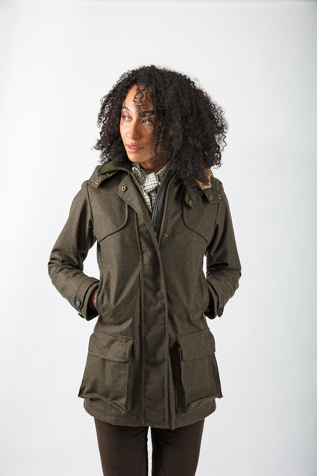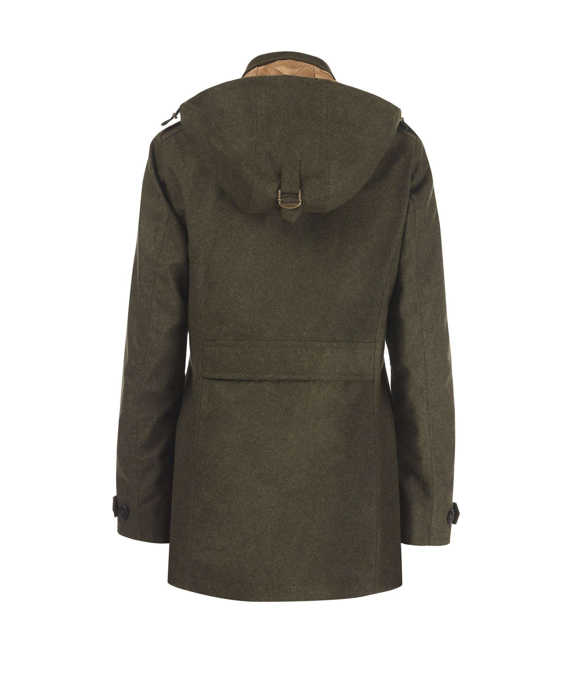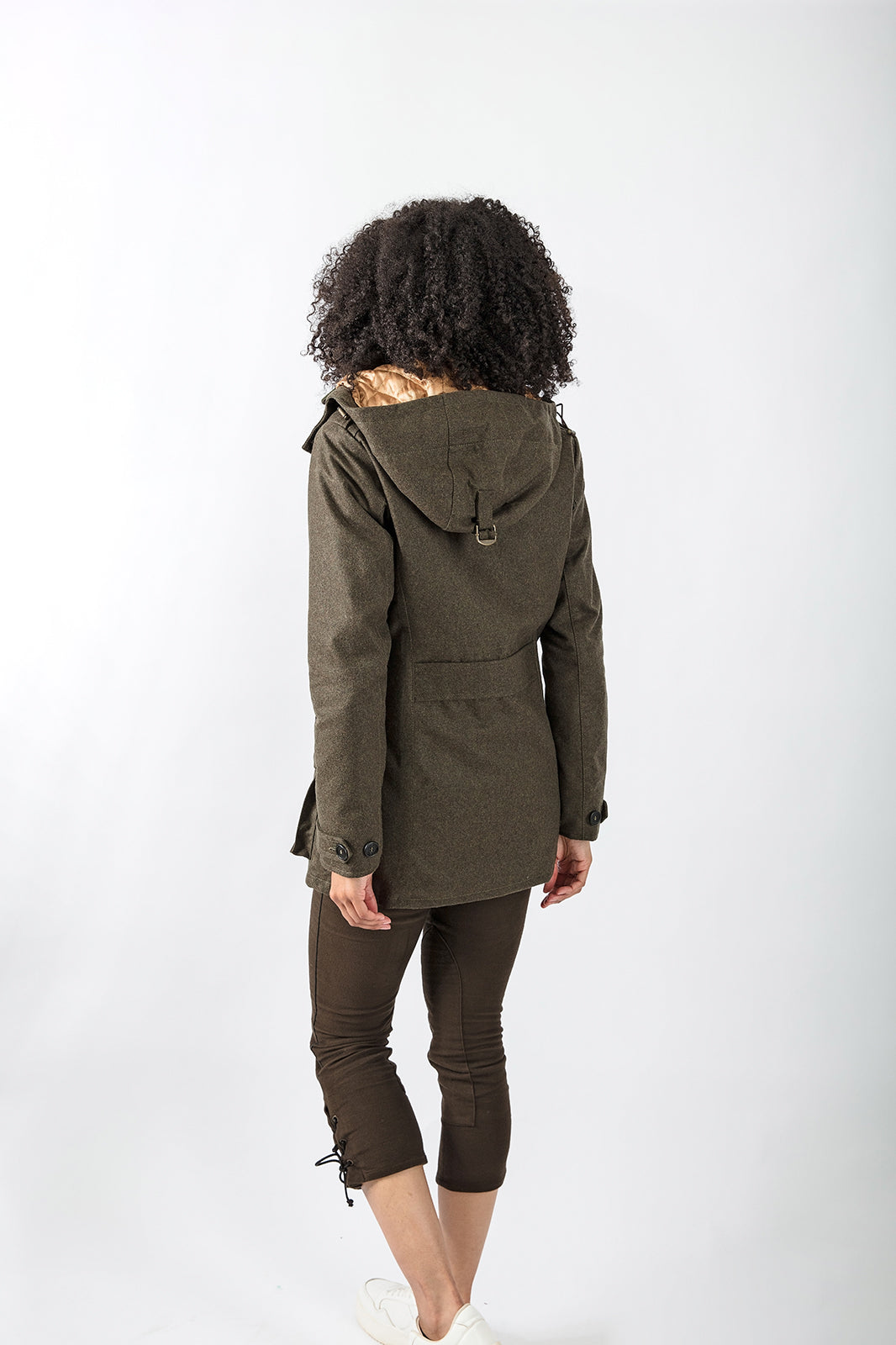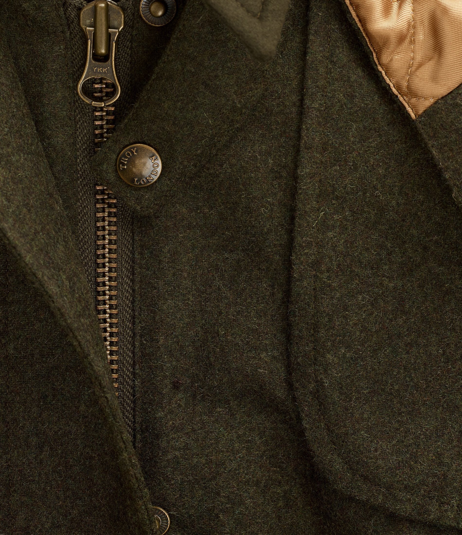 A warm, quilted outdoor coat in Melton Wool and soft Italian leather trims. 100% waterproof with generous removeable hood and high collar in soft faux moleskin fastened with TROY branded poppers for maximum protection. Inside zip pocket and warm, brushed cotton hand pockets sit above deep ventilated storage pockets with retainer strap.