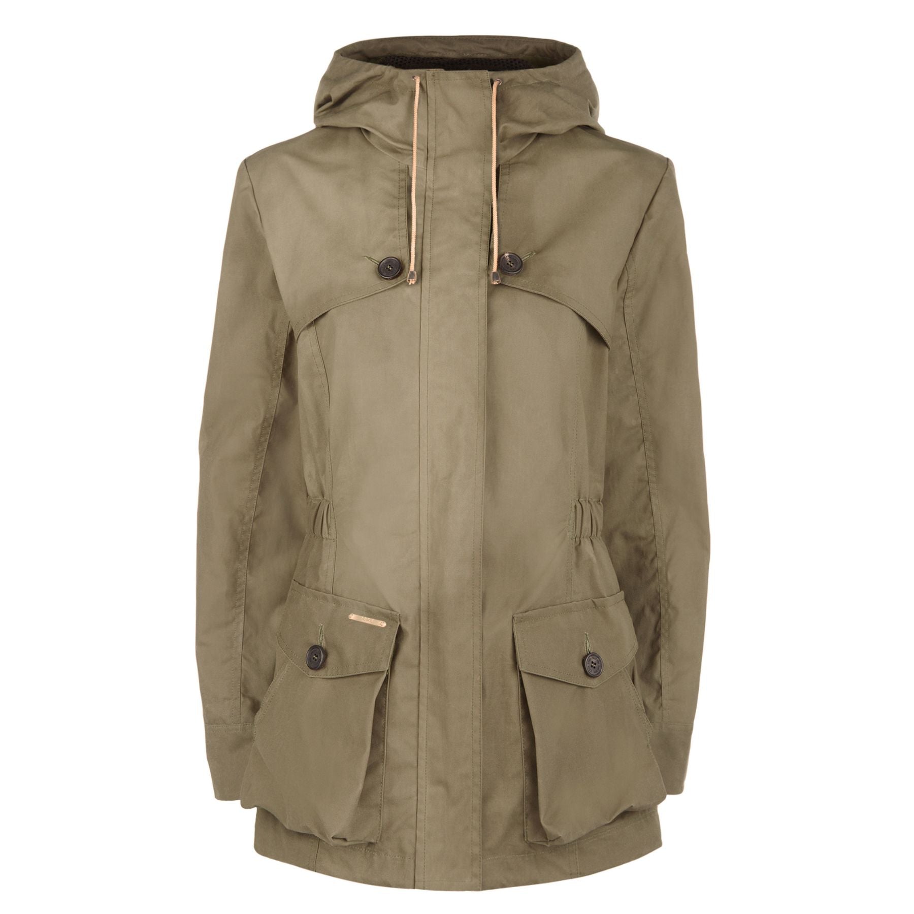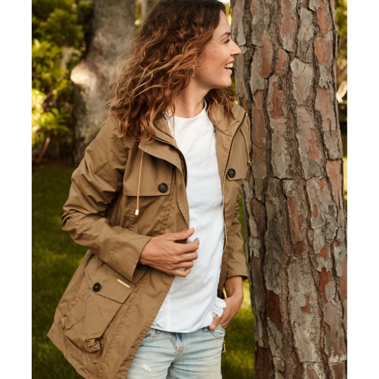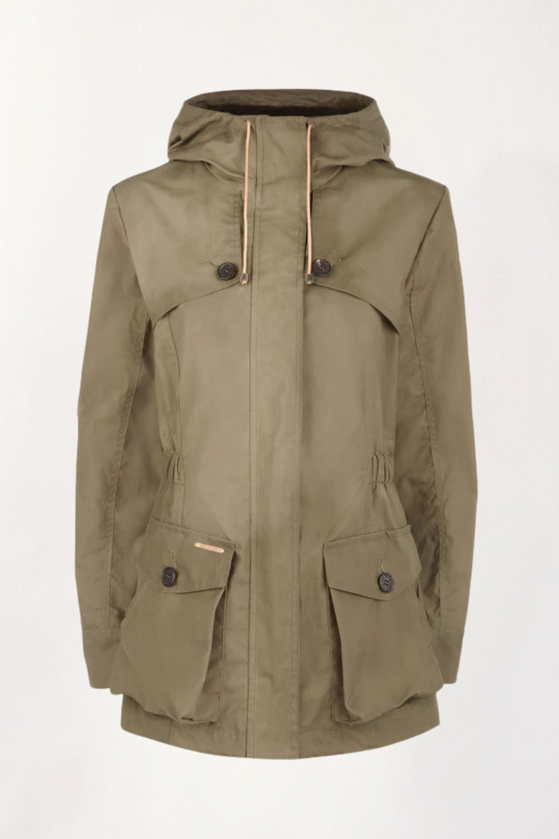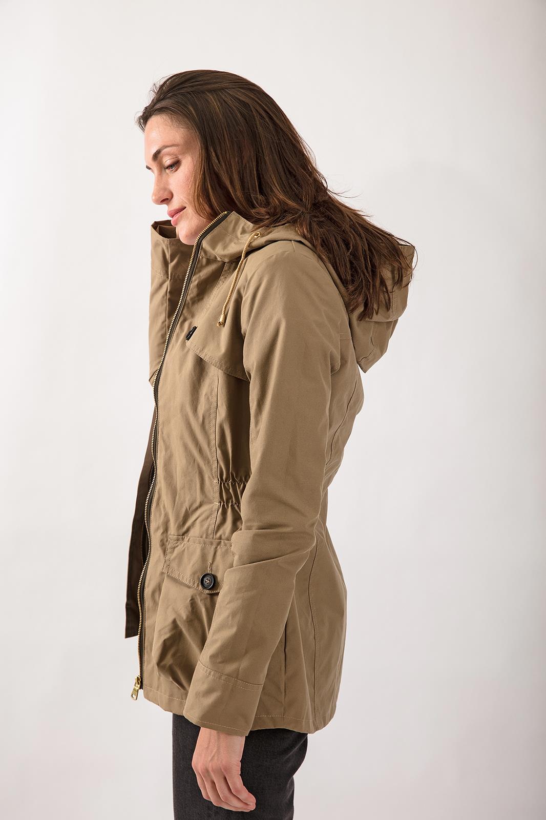 As worn by HRH The Princess of Wales, this lightweight coat is made from 100% cotton milled in England with a dry wax finish. A black sports-luxe lining provides fully waterproof protection and brings an urban appeal to this casual but elegant coat with a cinched waist and drawstring hood.