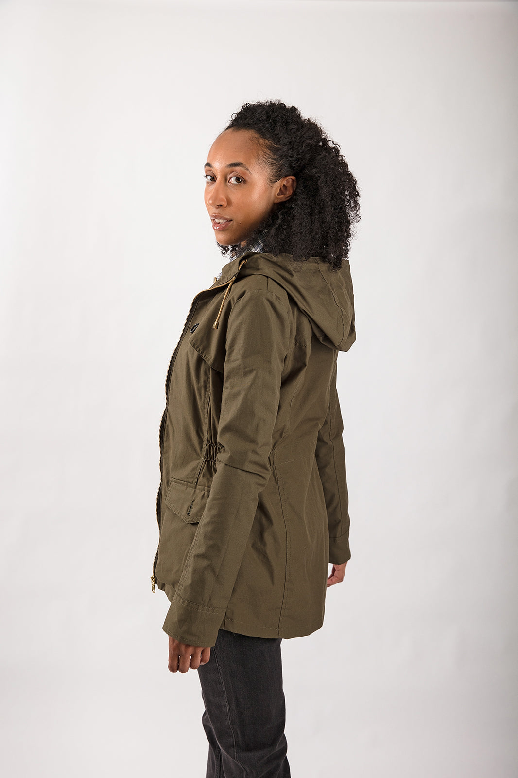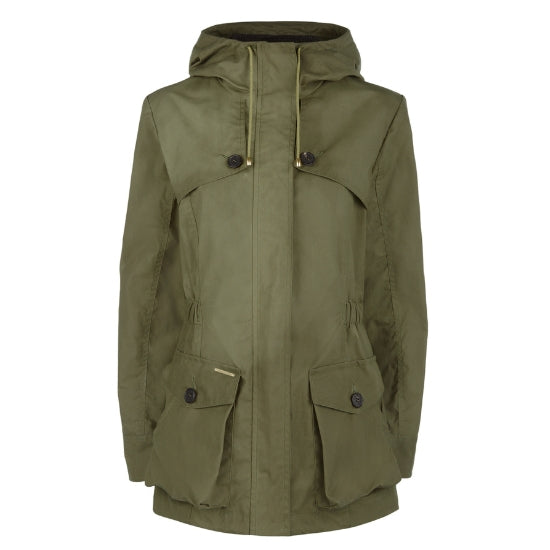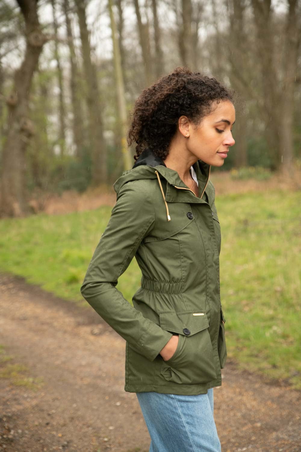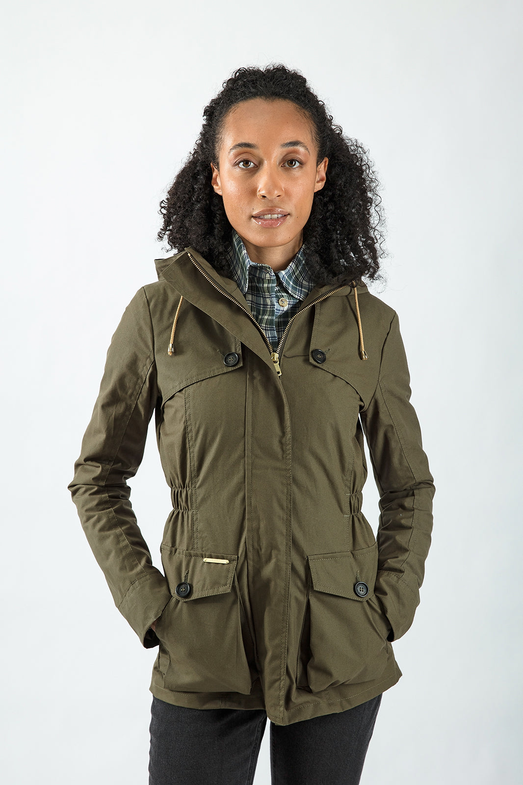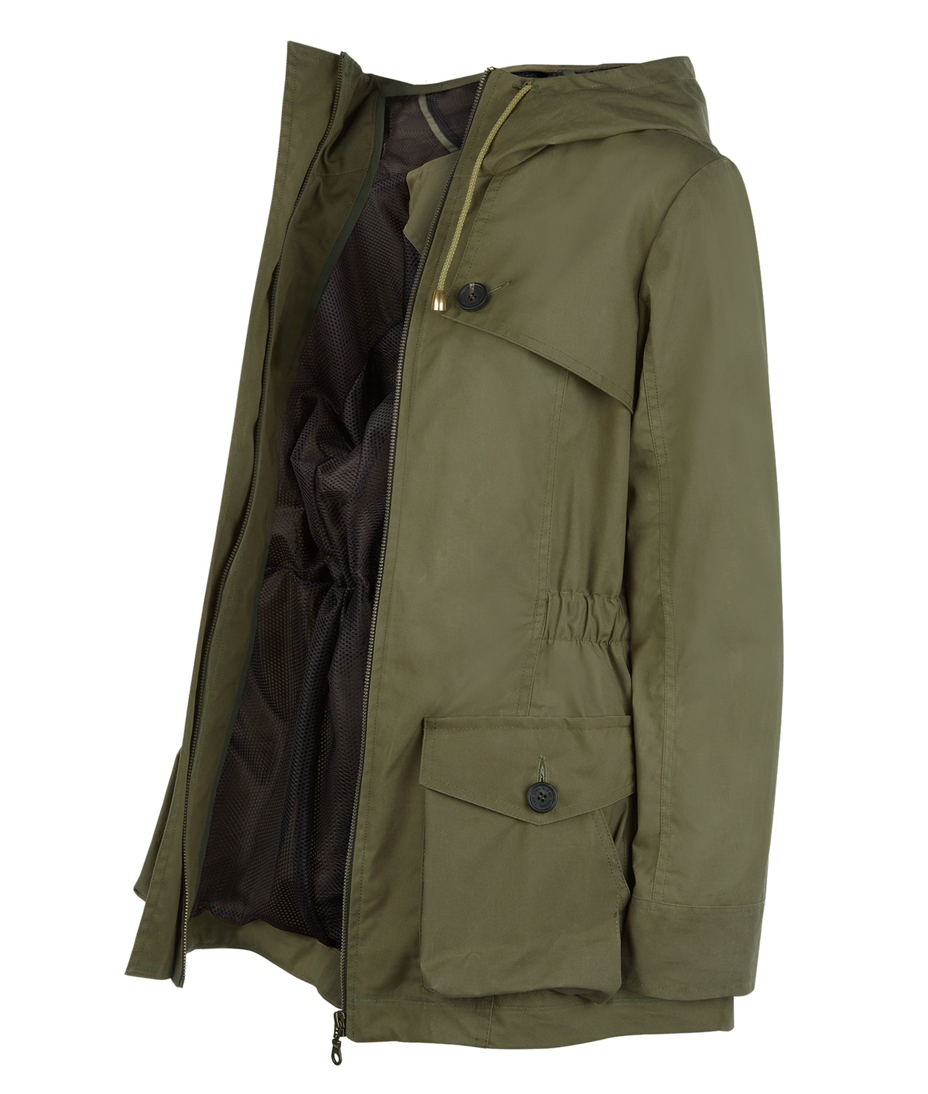 As worn by HRH The Duchess of Cambridge, this lightweight coat is made from 100% cotton milled in England with a dry wax finish. A black sports-luxe lining provides fully waterproof protection and brings an urban appeal to this casual but elegant coat with a cinched waist and drawstring hood.