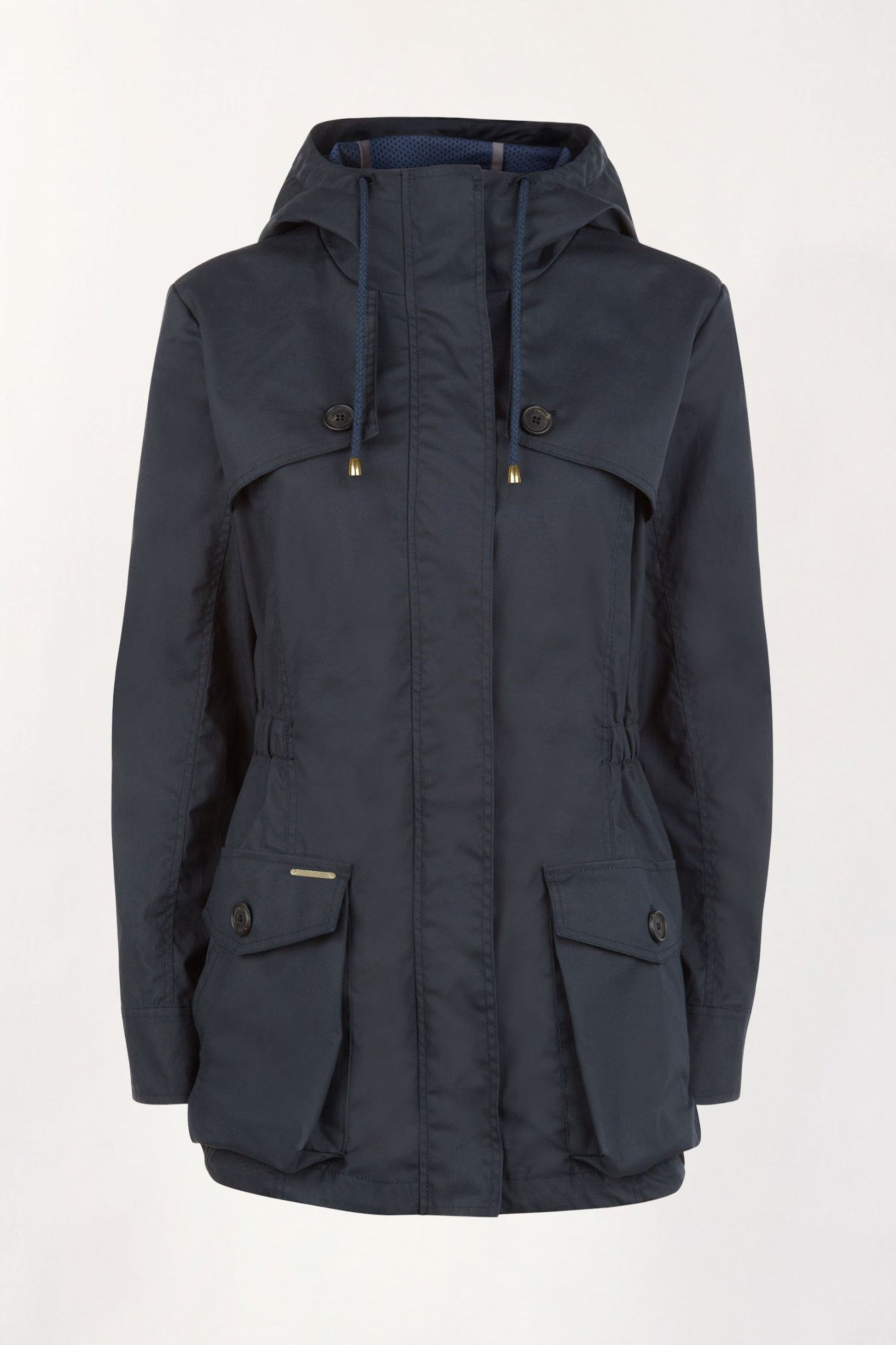 As worn by HRH The Duchess of Cambridge, this lightweight coat is made from 100% cotton milled in England with a dry wax finish. A black sports-luxe lining provides fully waterproof protection and brings an urban appeal to this casual but elegant coat with a cinched waist and drawstring hood.
